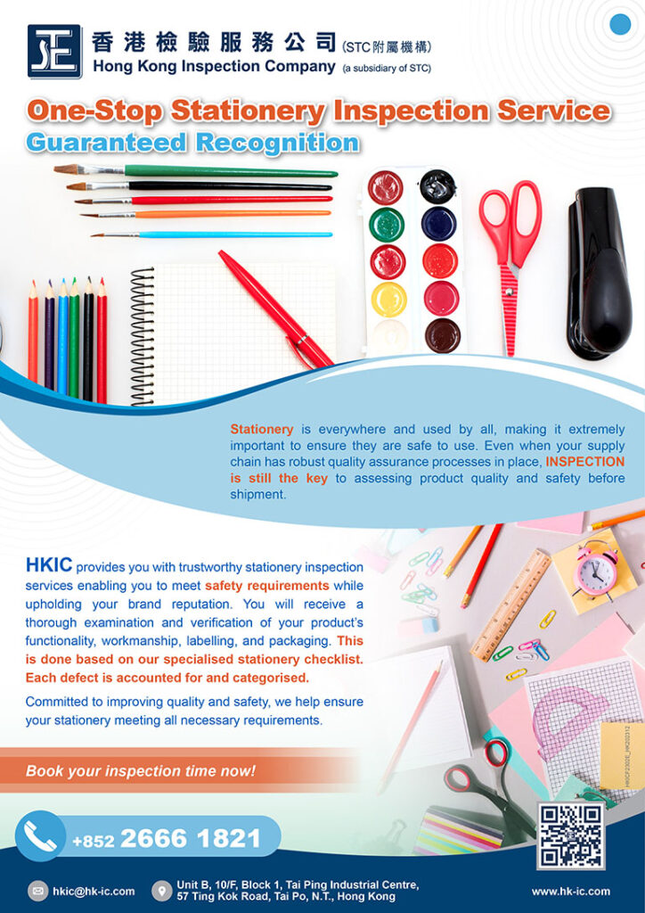 HKIC provides you with trustworthy stationery inspection service enabling you to meet the safety requirement. You will receive a thorough examination and verification of your product’s functionality, workmanship, labeling, and packaging. This is done based on our specialized stationery checklist. Each defect is accounted for as well as categorized.