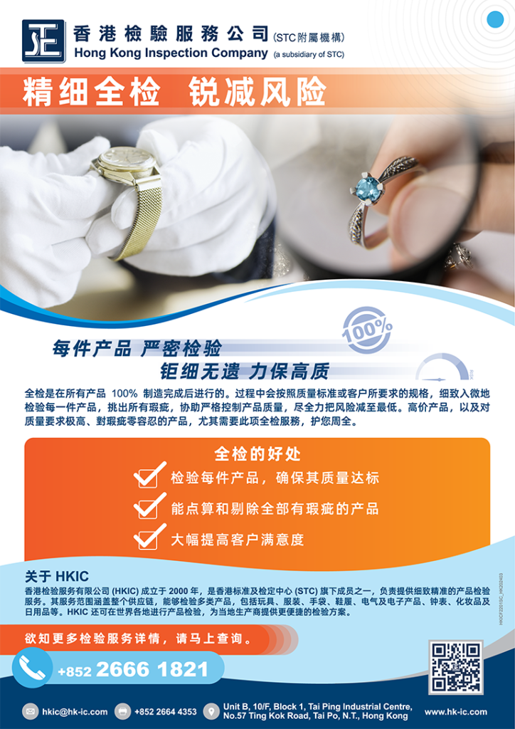 香港检验服务有限公司 (HKIC) 成立于 2000 年,是香港标准及检定中心 (STC) 旗下成员之一,负责提供细致精准的产品检验服务。 其服务范围涵盖整个供应链,能够检验多类产品,包括玩具、服装、手袋、鞋履、电气及电子产品、钟表、化妆品及日用品等。HKIC 还可在世界各地进行产品检验,为当地生产商提供更便捷的检验方案。
